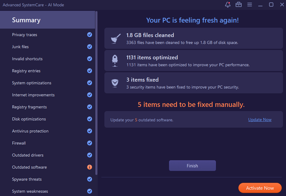 After reviewing the scan results, click the “Fix” button to clean up your PC and optimize its performance. Advanced SystemCare 17 will automatically remove junk files, fix registry errors, eliminate privacy traces, and improve system security based on the issues it detected. This process may take a few minutes, depending on the number of problems identified. Once it’s complete, you’ll notice immediate improvements in your system’s performance.