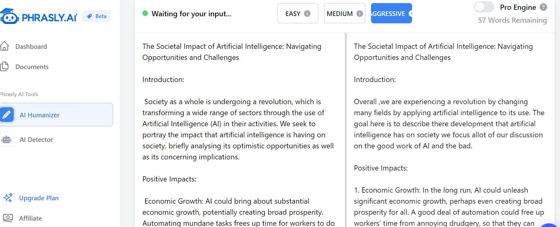 It becomes quite significant at this point. I took the text produced by AI, copied and pasted it into Phrasliy, and replaced it with human-written material. All you have to do is click the “Humanize” button located at the bottom of the page to finish it.