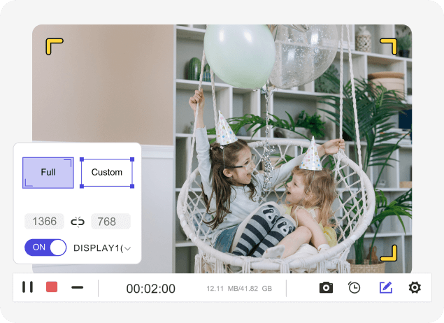 You may record any video from a streaming site in full screen or a custom screen size. Both the system audio and the microphone audio may be recorded, and the camera can be shown in the recording area or hidden.