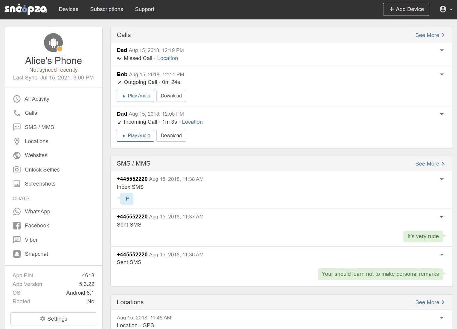 Another great feature of Snoopza Cell Phone Tracker is that it keeps track of all calls and text messages made by the user on their device.