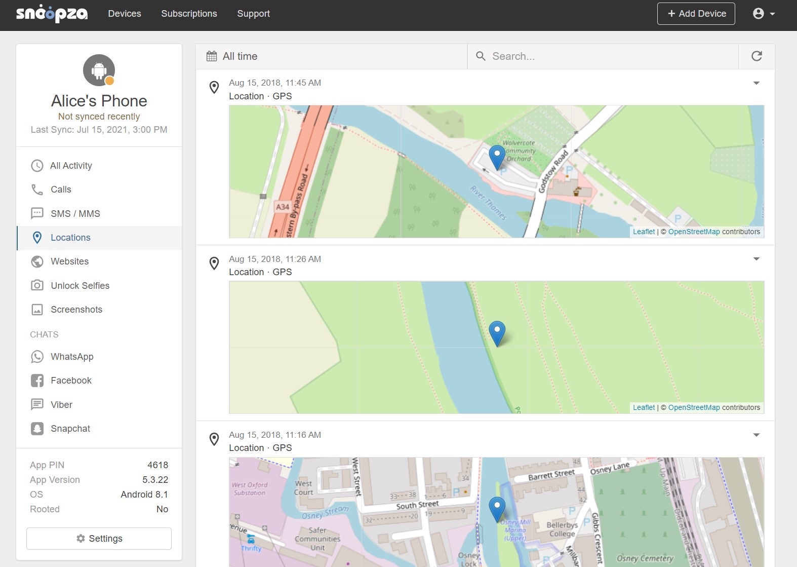 The Snoopza tracker comes with an app that allows you to view all the locations from which it has been tracked. You can also see where they were last seen and when they last used their phone, among other things.