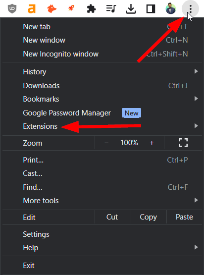 2. Go to the three dots (menu) in the top-right corner and select “Extensions” > “Chrome Web Store” or simply type “chrome://extensions” in the address bar.