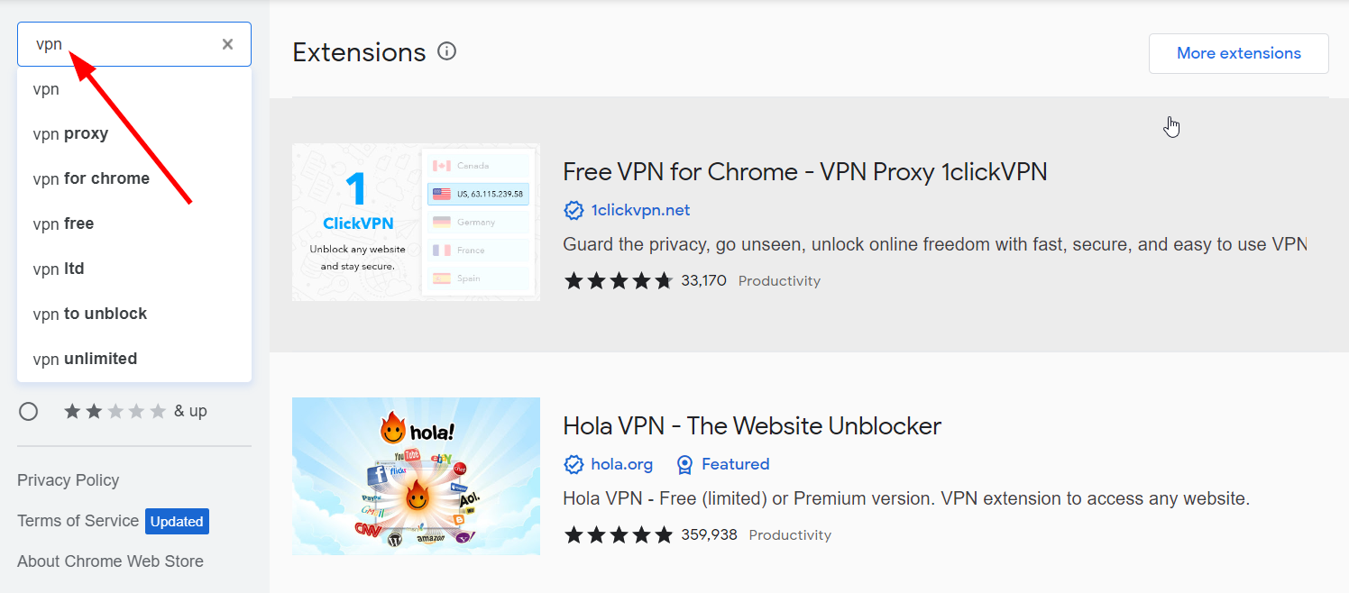 3. In the Chrome Web Store search bar, type in the name of the VPN extension you want to install (e.g., “VPN”).