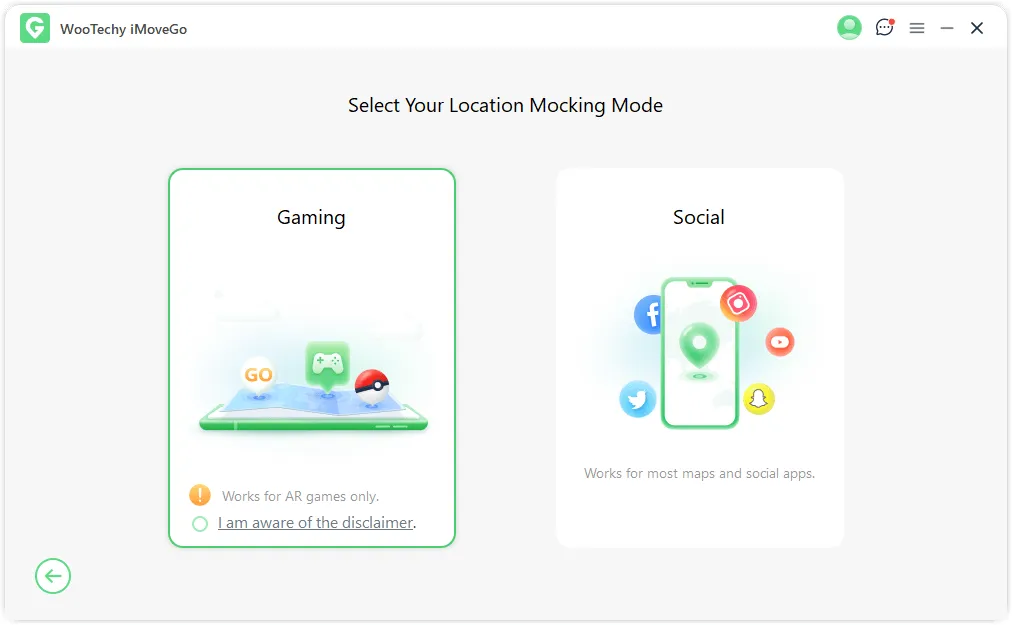 Step 3: Then, to spoof Pokemon Go Android, select Gaming Mode for Pokémon GO. (Use Social Mode for other apps like Snapchat)