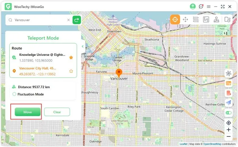 Step 4: Next, a map will load. To set a fixed fake location, select Teleport Mode. Then, go to the search bar in the upper-left corner and type in any destination in the world, you can try using GPS coordinates as well. Click “Move” to confirm the new location.