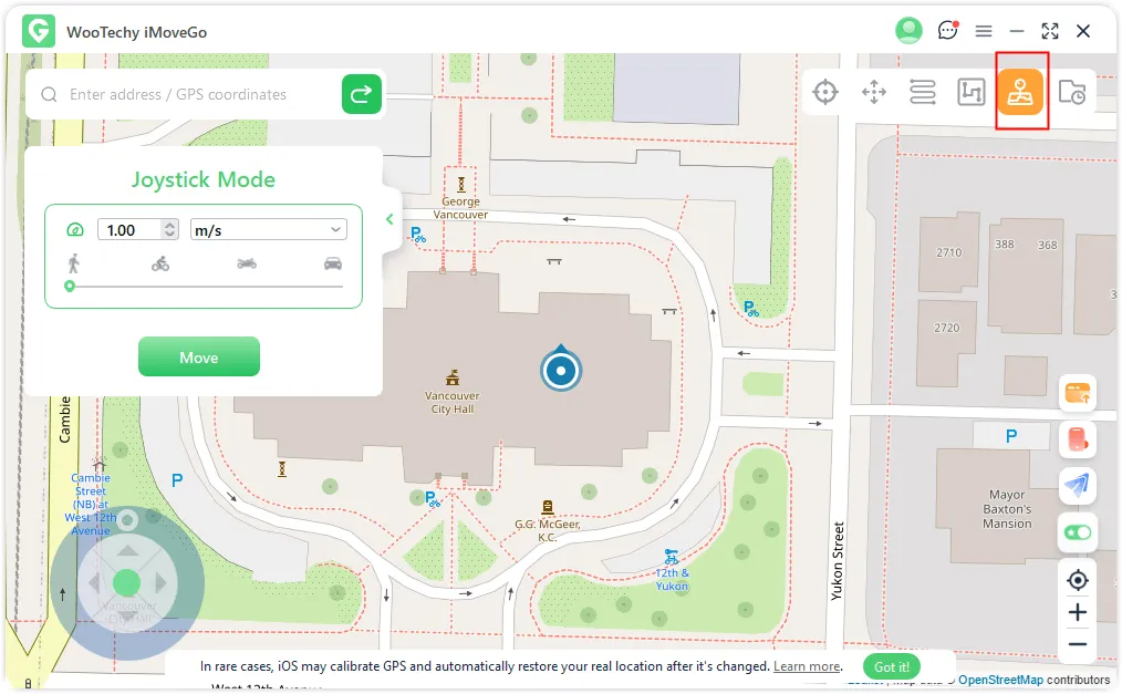 Now you have sucessfully teleported to your desired destination, and you can start your movement by selecting the first option – GPS Joystick. To control your movement, use your keyboard to move with ease or you can create a customized route by using 2-spot mode or multi-spot mode.