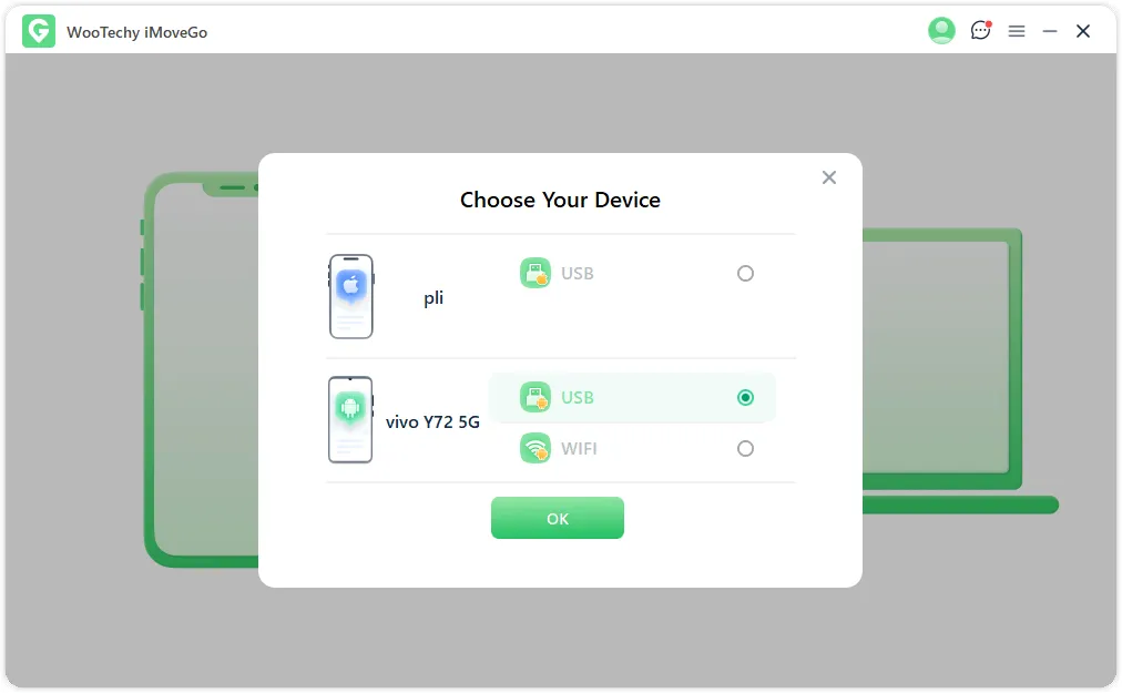 Step 1: Download the iMoveGo software on your Windows or Mac. Connect your device to your computer through USB Cable or WIFI. Once connected, select your device from the list.