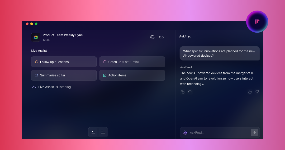 Joins video calls to record and transcribe conversations across Zoom, Google Meet, and Microsoft Teams. Delivers AI-generated summaries and extracted action items. The “AskFred” feature lets teams ask natural language questions about past meetings and get answers with source links. Winner of two G2 2025 Best Software Awards — Top 100 for Highest Customer Satisfaction and Top 50 for Best Collaboration & Productivity Products.