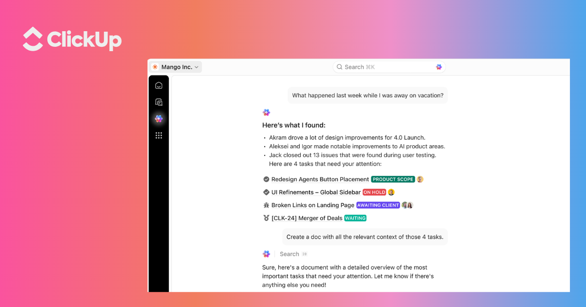 Consolidates tasks, docs, chat, and goals with “ClickUp Brain” responding to natural language queries. Ask “What’s blocking the mobile redesign?” and get answers from tasks, comments, and connected apps. Includes AI agents for sprint planning, standup facilitation, and project documentation. Featured in G2 Winter 2026 reports, more than any other product on the platform, with Top 3 placement in 526 of them.