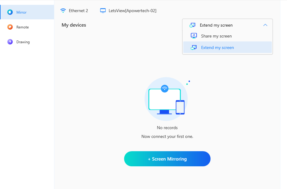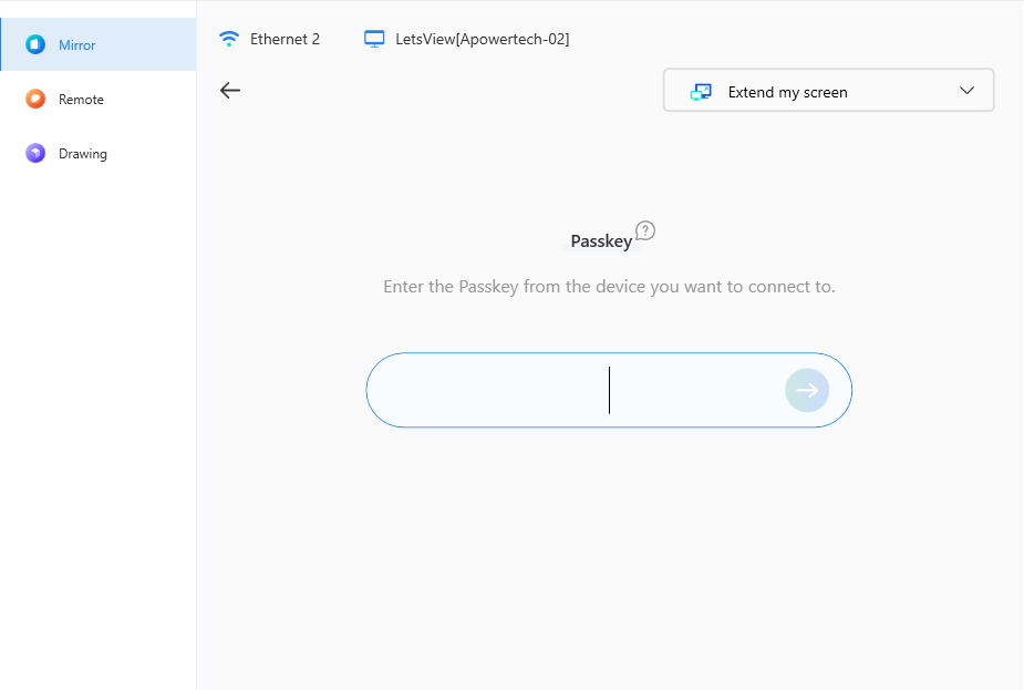 Open your PC, under “Mirror” choose the “Extend my screen” option on the drop-down arrow. Then, hit the “Screen Mirroring” button and enter the passkey number code that you will find on your tablet. After that, you may click the blue button with an arrow on it.
