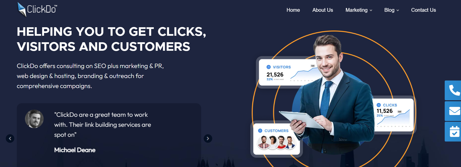 What it is: ClickDo is a UK-based digital marketing agency helping businesses improve visibility through SEO, content marketing, and web hosting solutions.